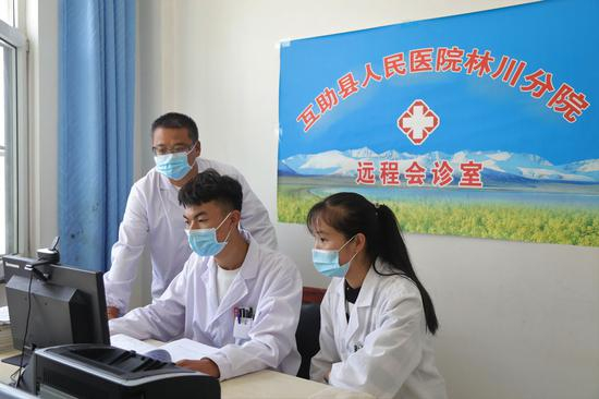 ↑在青海省海东市互助土族自治县林川卫生院远程会诊室,医生盛生凯(左二)和同事在连线互助县人民医院专家(2020年9月10日摄)。