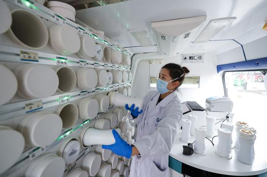 ↑2020年2月26日,在武汉江夏方舱医院院内的“流动应急智能中药房”里,系统把药方中包含的单味药用绿灯标识出来,工作人员将这些盛有单味中药浓缩颗粒的药瓶取下来准备制药。江夏方舱医院是武汉首个以中医院运转模式来进行临床治疗、管理的方舱医院。