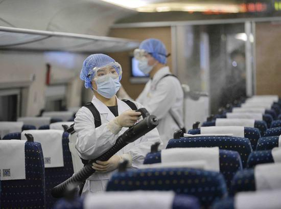 ↑2021年2月2日,中国铁路成都局集团有限公司成都疾病预防控制中心消毒监测科的消毒人员在对列车车厢进行消毒。