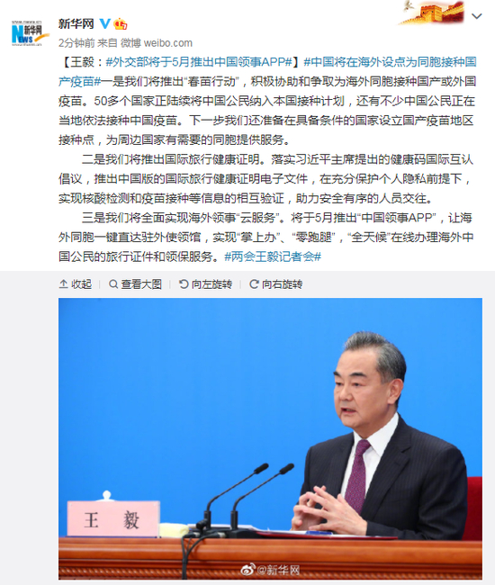 原标题:王毅:外交部将于5月推出中国领事APP