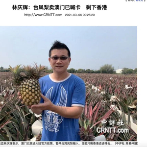 据香港媒体中评社报道称,自大陆海关3月1日起暂停输入台湾凤梨后,台湾岛内屡屡传出港澳地区也暂停引进台湾凤梨,而台湾辰农有机农场总监林庆辉3月6日在接受中评社采访时表示,大陆自3月1日发布暂停输入台湾凤梨后,3月2日起澳门也跟进了这项政策,目前仅剩香港地区还维持着对台凤梨输入贸易。