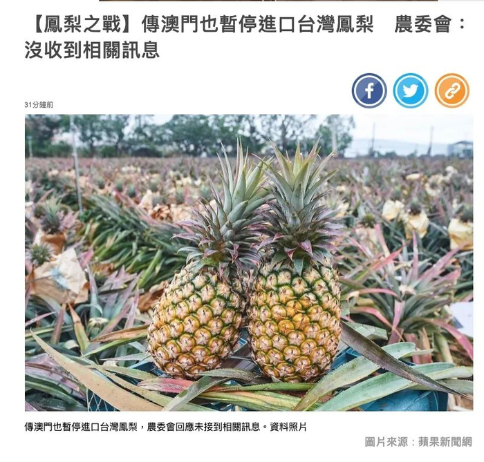 而据台湾绿媒《苹果日报》称,在得知澳门地区也暂停输入凤梨的消息之后,香港的《苹果》向一个专门做台湾和香港及澳门之间水果直销的经销商求证“现在是否仍可以将凤梨发往港澳”,对方明确表示这个星期他们的确已经不能发往澳门了,而前几个星期还可以,目前他们还是可以将凤梨发往香港。