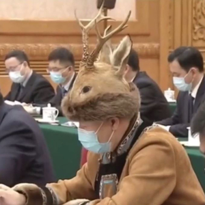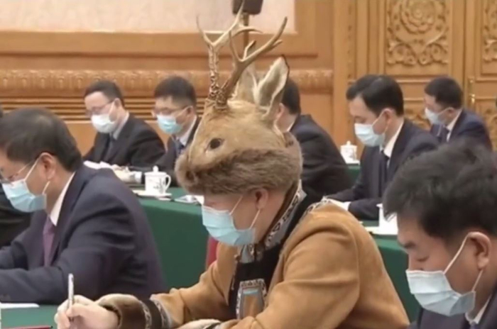 3月5日,这名代表穿戴的“小鹿头”,是一顶狍头皮帽,在鄂伦春语中也被称为“密哈塔”。其实,这不是狍头皮帽第一次“现身”两会了。 2013年3月5日,第十二届全国人民代表大会第一次会议在北京人民大会堂开幕。来自内蒙古的全国人大代表何胜宝,也曾头戴狍头皮帽赶赴会场,引人关注。