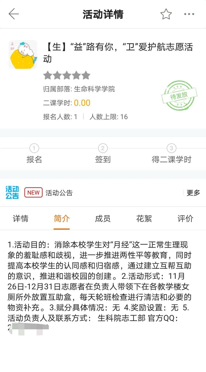 活动最开始打算落实的时候,汤千千专门去搜索了关于设置卫生巾互助盒的相关资料,发现这不止是简单地投放,还需要考虑很多问题。例如:互助盒要放在公共区域还是女厕所里?卫生巾的安全卫生如何保障?大家用之后会不会及时补充?如果出了安全问题该怎么办?“但在不断发现问题并找到对应的解决办法时真的很激动,想要赶快赶快落实下来!”