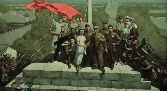 画作《424晴空万里·南京1949》中,有一位身着白旗袍的女性与一位解放军指挥官双手紧握,站在“总统府”顶楼的最前面。