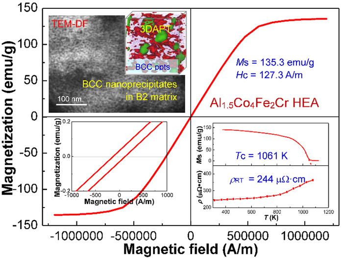 王清教授团队设计了一种全新的合金——Al1.5Co4Fe2Cr软磁高熵合金。该合金具有球形BCC纳米粒子在B2基体上共格析出的独特微观组织。由于BCC纳米粒子中含有磁性元素,且粒子尺寸仅为3-7 nm,这些纳米磁子的存在使得高熵合金具有高饱和磁化强度的同时,展现出极低的矫顽力;且高温长期时效后,合金仍具有优异的软磁性能,这归因于共格组织的高温稳定性,同时也提升了合金的居里温度。此外,高熵合金中多主元混合的本征成分特性增加电子散射的概率,从而大幅增加了合金电阻率,远高于现有软磁合金的电阻率(3-5倍),有效降低了合金的磁滞损耗,为其在高温环境中服役提供了保证。