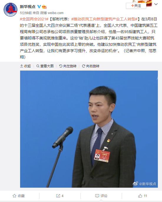 邹彬代表:推动农民工向新型建筑产业工人转型
