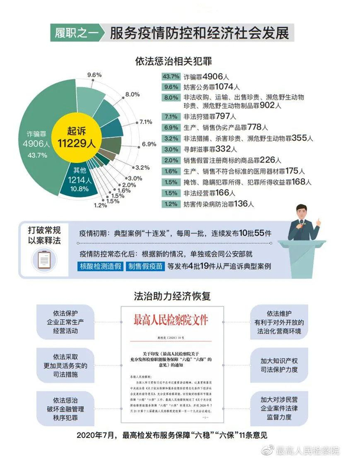 在依法履职战疫和促进经济恢复中弘扬伟大抗疫精神。及时出台系列司法政策,指导依法追诉妨害疫情防控犯罪,筑牢抗疫法治防线。继去年初打破常规、连续发布10批55件典型案例后,因应疫情防控常态化,再就核酸检测造假、制售假疫苗等发布4批19件从严追诉典型案例,指导办案、震慑犯罪、预警社会。湖北等地检察机关宽严相济,批捕涉疫犯罪7227人、起诉1.1万人。坚决贯彻党中央统筹推进疫情防控和经济社会发展部署,制定实施“11条意见”,服务“六稳”“六保”。突出稳企业保就业,用好司法政策,助力各类企业复工复产、渡过难关。有力惩治侵害民营企业合法权益的犯罪,起诉2.3万人,同比上升2.9%。持续清理长期未侦结的涉企“挂案”,2019年排查的2687件已督促办结2315件;去年再会同公安部排查督办5088件,为企业解绊,促放手发展。对民营企业负责人涉经营类犯罪,依法能不捕的不捕、能不诉的不诉、能不判实刑的提出适用缓刑建议,同时探索督促涉案企业合规管理,促进“严管”制度化,不让“厚爱”被滥用。检察机关受理一起串通投标案,查明6家涉案企业系受黑社会性质组织胁迫出借资质,对涉黑犯罪依法严惩,对企业则依法不起诉,促其规范经营。开展企业控告申诉专项清理,排查2.1万件,支持企业合法诉求5519件。助力企业发展同时,依法维护劳动者合法权益,发布恶意欠薪犯罪典型案例,起诉1821人,支持农民工起诉讨薪维权1.1万件。严格区分恶意欠薪与周转困难而欠资,以精准司法保企业、为员工利益谋长远。
