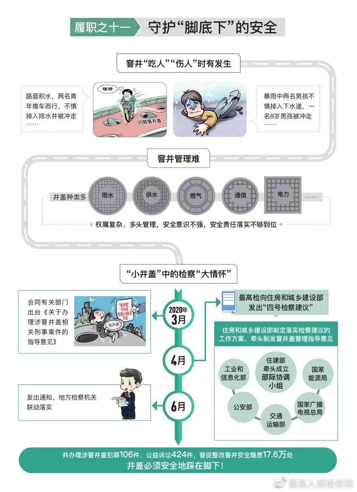 守护“舌尖上”“脚底下”的安全。与国家市场监督管理总局等联合开展“四个最严”专项行动,会同国务院食品安全办等10部门完善线索移送、案件通报等协作机制,起诉制售有毒有害食品、假药劣药等犯罪8268人,办理食品药品安全领域公益诉讼案件2.7万件。联手最高人民法院、公安部出台指导意见,对盗窃、破坏公共场所窨井盖行为,以破坏交通设施等危害公共安全犯罪追诉。办理涉窨井盖刑事犯罪106件、公益诉讼424件。梳理办案中发现的窨井施工、管理、养护等方面问题,向住房和城乡建设部发出第四号检察建议,该部牵头制发窨井盖管理指导意见,促进对水电气、供暖、通信、广电等各类井盖联手共治;地方检察机关联动落实,督促整改窨井安全隐患17.6万处。井盖必须安全地踩在脚下。