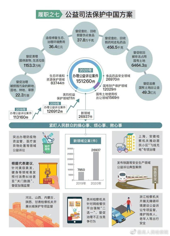 公益诉讼检察有序拓展。公益司法保护中国方案令人瞩目。去年立案办理公益诉讼案件151260件,其中,民事公益诉讼1.4万件,行政公益诉讼13.7万件,同比分别上升1倍和14.4%。最高人民检察院和省级检察院直接办理了一批跨区域和影响性案件。践行双赢多赢共赢理念。建立磋商机制,拟提出检察建议的先促请行政机关主动履职。针对一些污染企业违规享受相关税收优惠政策,与国家税务总局共同核实、督促整改,推动环保处罚信息共享,税收优惠政策进一步完善。发出诉前检察建议11.8万件,同比上升14.1%;行政机关回复整改率99.4%,更多问题诉前即获解决。将提起诉讼做成生动法治课堂。检察建议不能落实的,则提起诉讼,将案件办成法治样本,促进依法行政,警示、教育社会面。起诉8010件,同比上升67.6%;法院审结5976件,支持起诉意见5935件。拓展案件范围。对群众反映强烈的新领域公益损害问题立案2.7万件,是2019年的3.4倍。发布铁路安全生产领域公益诉讼典型案例,推动沿线环境安全治理。河北、山西、内蒙古、陕西、甘肃检察机关开展长城保护专项监督,新疆检察机关开展文物古迹专项保护行动。上海、安徽检察机关推动居民小区电动车“飞线充电”专项治理,维护城市公共安全。贵州检察机关针对网络餐饮平台强制“二选一”,督促主管部门治理不正当竞争行为,保护消费者合法权益。