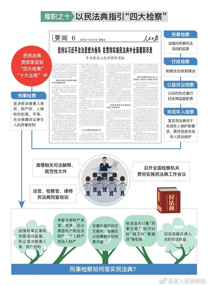 以民法典指引检察履职。召开贯彻实施民法典工作会议,全员线上专题培训,全面清理司法解释及相关规范性文件。以贯彻实施民法典为契机,树立权力监督与权利救济相结合的民事检察思维,确立法定性与必要性相统一的民事检察监督标准。把民法典作为“四大检察”的重要价值指引,刑事追诉秉持客观公正立场,平等、充分保障诉讼参与人的民事权利,坚决防止和纠正以刑事案件名义插手民事纠纷、经济纠纷。对违法取证、违法查封扣押冻结等侵犯人身权、财产权、人格权的侦查活动违法情形,提出纠正意见5万件次。妥善处理刑事和民事法律关系交叉案件,对于民事欺诈、合同纠纷案件,准确判断主观故意,谨防违法追诉;对打着民事交易、经济纠纷幌子,实为侵财犯罪的“套路贷”等,严格依法追诉。