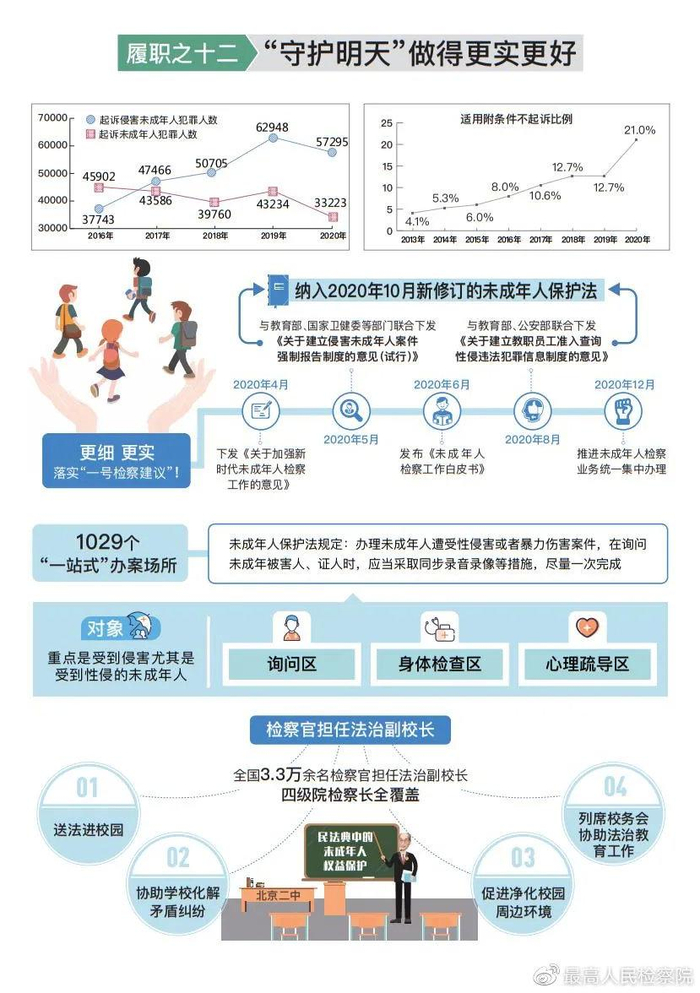 倾情守护未成年人安全健康成长。从严追诉性侵、虐待未成年人和拐卖儿童等犯罪5.7万人。会同有关部门建成1029个“一站式”办案场所,促进询问、证据提取一次完成,尽力防止“二次伤害”。对监护人侵害和监护缺失,支持起诉、建议撤销监护人资格513件,是2019年的6.3倍。未成年人涉嫌犯罪既应依法惩戒,更要教育帮扶,重在转化。起诉涉嫌犯罪的未成年人3.3万人。对罪行较轻并有悔改表现的附条件不起诉1.1万人,占办结未成年人案件总数的21%,同比增加8.3个百分点。福建福州检察机关探索运用督促监护令,促家长履行管教义务。湖南检察机关办理校园性侵案发现,某校两名负责人知情后既未认真核实也未向有关部门报告,依法以玩忽职守罪追究刑事责任。未成年人保护法修订,吸收最高人民检察院会同教育部、国家卫健委等推行的侵害未成年人案件强制报告、教职员工入职前查询违法犯罪记录制度。孩子就是未来,司法保护要持续做得更实。