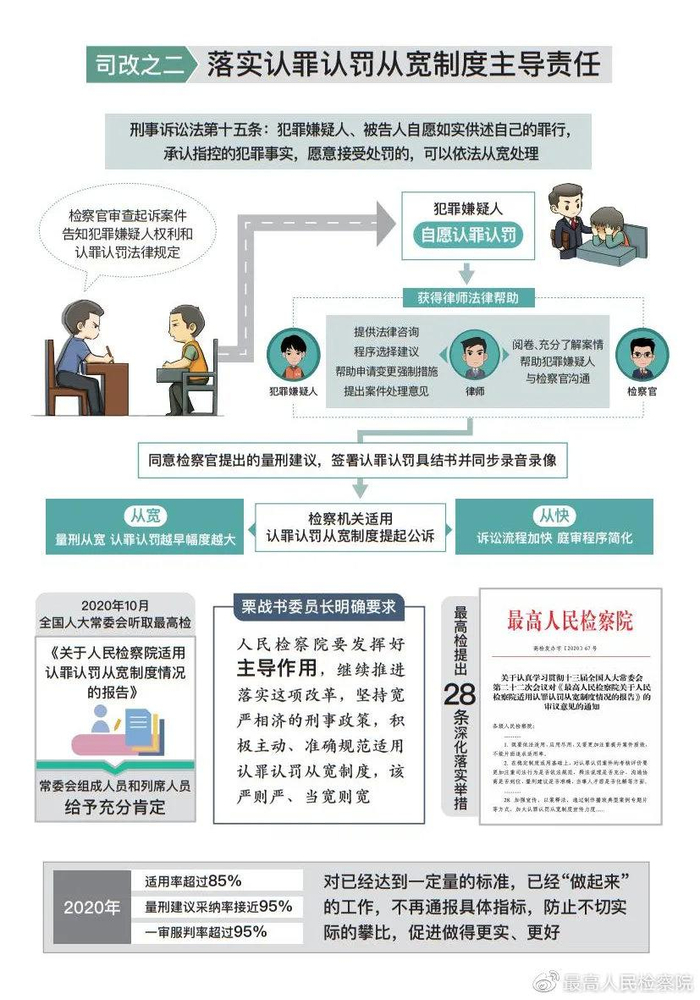 深入落实认罪认罚从宽制度。这一制度源出我国经济发展、社会安定,犯罪结构明显变化,重罪占比持续下降,轻罪案件不断增多。判处不满三年有期徒刑及以下刑罚案件,从2000年占53.9%升至2020年的77.4%。全面贯彻宽严相济刑事政策,重罪须从严追诉,轻罪则依法宽缓;促进认罪认罚、少捕慎诉慎押,更利矛盾化解、社会治理。检察机关在刑事诉讼中承前启后,积极履行主导责任,携手公安机关、人民法院该用尽用、规范适用。全面审查案件事实、证据,不因认罪而降低证明标准。区分案件性质、情节和社会危害,对依法可不批捕和犯罪情节轻微、不需要判处刑罚的,不批捕8.8万人、不起诉20.2万人,占已办结案件比例分别增加0.8和3.9个百分点。捕后认罪认罚可不继续羁押的,建议释放或变更强制措施2.5万人。审前羁押从2000年占96.8%降至2020年的53%。向全国人大常委会专题报告制度适用情况,围绕审议意见推出28条深化落实举措。全年认罪认罚从宽制度适用率超过85%;量刑建议采纳率接近95%;一审服判率超过95%,高出其他刑事案件21.7个百分点。司法效率更高,办案效果更好。