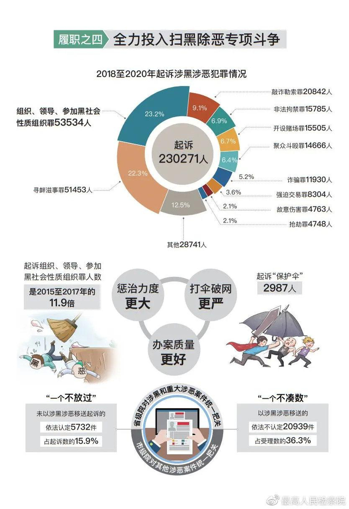 推动扫黑除恶专项斗争取得全面胜利。检察机关参与三年为期的专项斗争,一开始就明确提出“是黑恶犯罪一个不放过、不是黑恶犯罪一个不凑数”,省级检察院对涉黑和重大涉恶案件严格把关;会同有关部门制定9个指导性文件,统一办案标准;对150起重大案件挂牌督导。2018年以来,共批捕涉黑涉恶犯罪14.9万人,起诉23万人,其中起诉组织、领导、参加黑社会性质组织犯罪5.4万人,是前三年的11.9倍。对未以涉黑涉恶移送起诉的,依法认定5732件,占起诉数的15.9%;以涉黑涉恶移送,依法不认定2.1万件,占受理数的36.3%。坚持除恶务尽,起诉“保护伞”2987人。结合办案推动重点行业领域依法治理,社会治安秩序明显改善:去年受理审查起诉刑事案件为近4年最低,严重暴力犯罪案件为近20年最低。党中央坚强领导下的这场专项斗争,惩治力度更大、办案质量更好、“打伞破网”更严,人民群众以更实在的安全感步入全面小康。