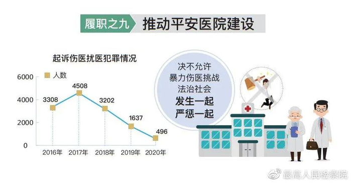 彰显法治的温暖与力量。坚决维护国防利益和军人军属合法权益。起诉破坏军事设施、破坏军婚等涉军犯罪381人。与有关部门制定加强退役军人司法救助工作意见,救助378名遭受不法侵害的军人军属、退役军人,是2019年的3倍。办理军用土地保护和军营周边环境整治以及机场净空、舰艇航道、军事设施维护等公益诉讼151件。某军用机场附近企业违法排放,严重影响部队战训。辽宁军地检察机关联署发出检察建议,驻地政府迅即整治,多年扰军难题得到系统治理。切实维护港澳台同胞、海外侨胞和归侨侨眷合法权益。依法妥善办理涉港澳台和涉侨案件。浙江青田“检侨之家”以远程视频为海外华侨解申诉难题。坚决严惩任何一起伤医扰医犯罪。起诉496人,在前两年大幅下降基础上,同比再下降69.7%。高度重视特殊群体权益保障。会同中国残联推广杭州经验,开展无障碍环境建设公益诉讼,“有爱无碍”让残障人士放心出门。针对“无码老人”出行、消费困难,开展信息无障碍公益诉讼,促请职能部门消除“数字鸿沟”。与全国妇联完善保护妇女儿童权益协作机制。