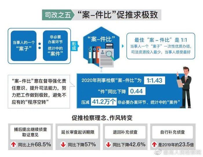 深化运用“案-件比”质效评价标准。发布以“案-件比”为核心的案件质量评价指标,以知促行,引导检察办案求极致,惠及群众、减少讼累。2020年刑事检察“案-件比”1:1.43,“件”同比下降0.44,压减了41.2万个非必要办案环节、统计中的“案件”。更重要的是检察理念、作风在转变:延长审查起诉期限、退回补充侦查同比分别下降57%和42.6%;自行补充侦查4.8万件,是2019年的23.5倍;不捕不诉率进一步上升,公安机关提请复议复核则下降40.2%,办案质效明显提升。