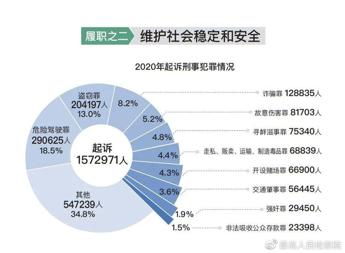 坚决维护国家安全和社会安定。坚持总体国家安全观,严厉打击境内外敌对势力渗透破坏活动。坚决贯彻香港特别行政区维护国家安全法。支持新疆等地依法防治暴恐犯罪,确保社会大局持续稳定、长期稳定。对杀人、抢劫等严重暴力犯罪始终保持高压态势,起诉5.7万人,核准追诉“南医大女生被害案”等35起陈年命案。突出惩治盗窃、诈骗、抢夺等多发性侵财犯罪,起诉35万人。依法惩治黄赌毒犯罪,起诉21.2万人。