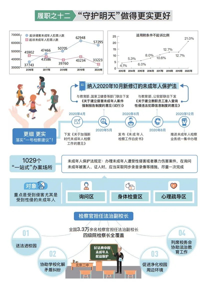 倾情守护未成年人安全健康成长。从严追诉性侵、虐待未成年人和拐卖儿童等犯罪5.7万人。会同有关部门建成1029个“一站式”办案场所,促进询问、证据提取一次完成,尽力防止“二次伤害”。对监护人侵害和监护缺失,支持起诉、建议撤销监护人资格513件,是2019年的6.3倍。未成年人涉嫌犯罪既应依法惩戒,更要教育帮扶,重在转化。起诉涉嫌犯罪的未成年人3.3万人。对罪行较轻并有悔改表现的附条件不起诉1.1万人,占办结未成年人案件总数的21%,同比增加8.3个百分点。福建福州检察机关探索运用督促监护令,促家长履行管教义务。湖南检察机关办理校园性侵案发现,某校两名负责人知情后既未认真核实也未向有关部门报告,依法以玩忽职守罪追究刑事责任。未成年人保护法修订,吸收最高人民检察院会同教育部、国家卫健委等推行的侵害未成年人案件强制报告、教职员工入职前查询违法犯罪记录制度。孩子就是未来,司法保护要持续做得更实。