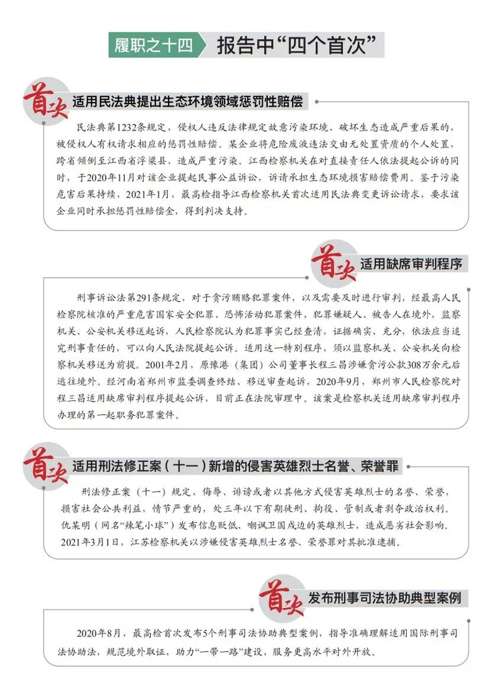 促进完善社会治理体系。用典型案件引领法治、促进治理是检察办案的更高追求。定期发布检察办案数据、发案特点及趋势,以“检察专报”引导动态防治。发布“遭遇暴力传销反击案”“反抗强奸致施暴男死亡案”“阻止非法暴力拆迁伤人案”等6起正当防卫不捕不诉典型案例,诠释正当防卫理念和规则,坚定捍卫“法不能向不法让步”。2018年底发布“昆山反杀案”指导性案例后,2019年和2020年因正当防卫不捕不诉819人,是之前两年的2.8倍。与公安部等出台指导意见,严惩以“被害”为名设局索财,让“碰瓷”者“碰壁”。网络大V“辣笔小球”恶意诋毁贬损卫国戍边英雄官兵,江苏检察机关迅速介入,依法适用今年3月1日起施行的刑法修正案(十一),首次以涉嫌侵害英雄烈士名誉、荣誉罪批准逮捕,并在军事检察机关支持配合下,开展公益诉讼调查。英烈不容诋毁、法律不容挑衅。