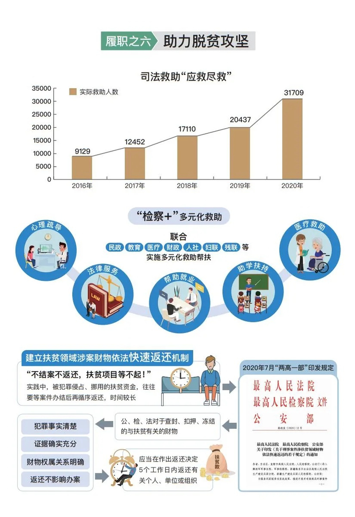 在决战脱贫攻坚中贡献检察力量。用好国家司法救助制度,对因犯罪侵害等致生活陷入困境的被害人及其近亲属“应救尽救”,防止因案致贫返贫。救助3.2万人4.2亿元,同比分别上升55.2%和61.3%。湖南检察机关办理一起涉黑案时,发现被害人遗孤无人照管,在安置、救助同时,协调民政、教育部门解决其监护和就学问题。为让被侵占、挪用的扶贫资金尽早发挥作用,推广云南经验,建立扶贫领域涉案财物依法快速返还机制,改变不结案不返还惯常做法,会同有关机关一体实施。去年检察办案中快速返还1.2亿元,惠及3.2万人。