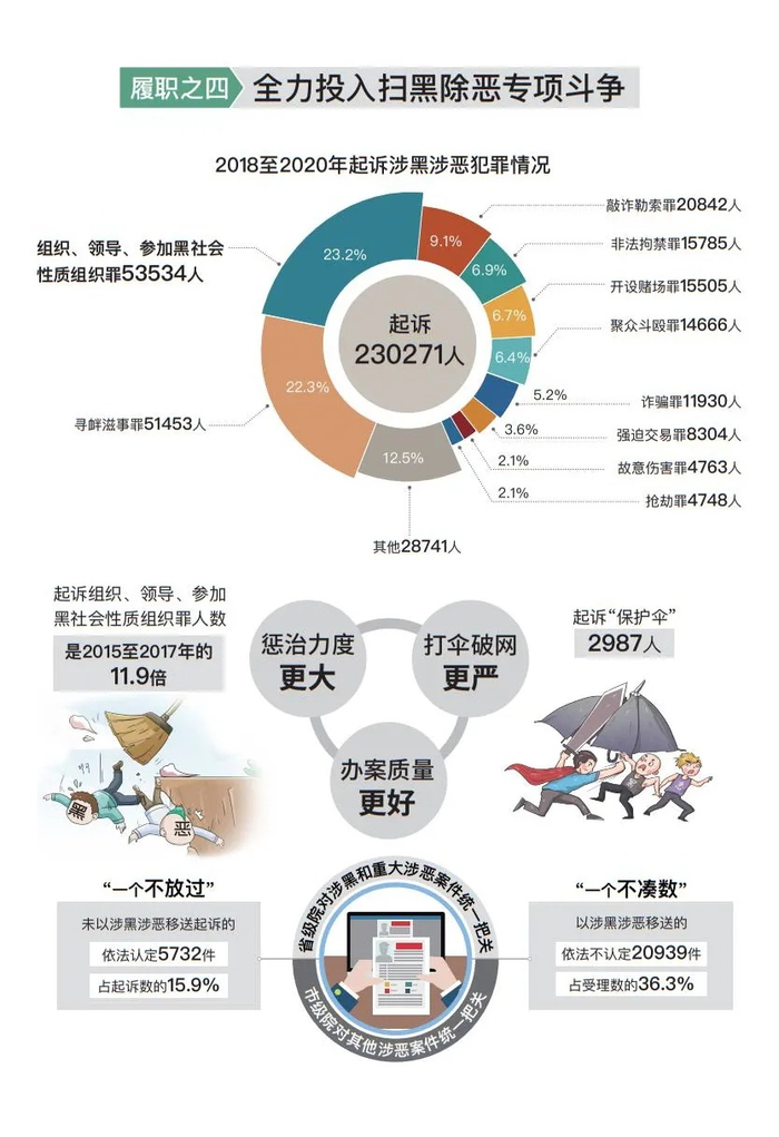 推动扫黑除恶专项斗争取得全面胜利。检察机关参与三年为期的专项斗争,一开始就明确提出“是黑恶犯罪一个不放过、不是黑恶犯罪一个不凑数”,省级检察院对涉黑和重大涉恶案件严格把关;会同有关部门制定9个指导性文件,统一办案标准;对150起重大案件挂牌督导。2018年以来,共批捕涉黑涉恶犯罪14.9万人,起诉23万人,其中起诉组织、领导、参加黑社会性质组织犯罪5.4万人,是前三年的11.9倍。对未以涉黑涉恶移送起诉的,依法认定5732件,占起诉数的15.9%;以涉黑涉恶移送,依法不认定2.1万件,占受理数的36.3%。坚持除恶务尽,起诉“保护伞”2987人。结合办案推动重点行业领域依法治理,社会治安秩序明显改善:去年受理审查起诉刑事案件为近4年最低,严重暴力犯罪案件为近20年最低。党中央坚强领导下的这场专项斗争,惩治力度更大、办案质量更好、“打伞破网”更严,人民群众以更实在的安全感步入全面小康。