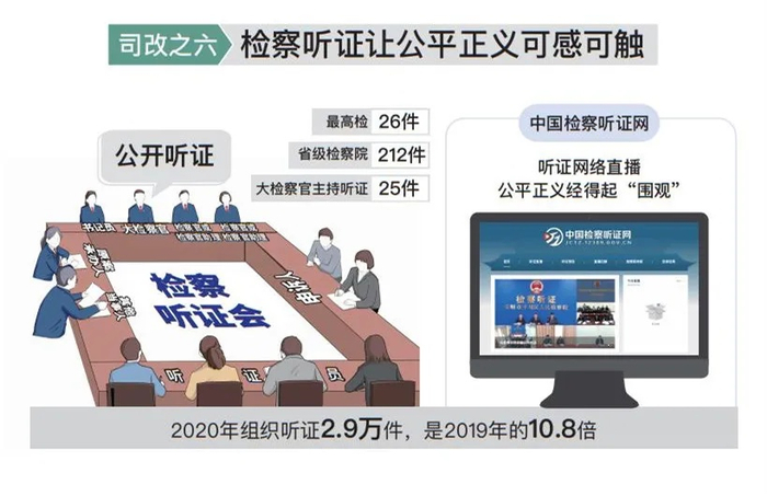 以公开听证办好群众信访。去年新收群众信访92.7万件,均在7日内告知“已收到、谁在办”,3个月内办理过程或结果答复率99.8%。及时回复、用心办理赢得群众信赖,检察机关信访总量同比下降4.3%,重复访同比下降13.8%。坚持和发展新时代“枫桥经验”,集中办理信访积案2.5万件,其中5年以上的1018件全部办结。推广河南经验,各级检察院检察长承办多年难结案件,接访办案3.3万人次,是2019年的2.4倍。对重大争议或影响性案件,创新以听证形式公开审查。大检察官带头,四级检察院全覆盖,组织听证2.9万件,是2019年的10.8倍。邀请人大代表、政协委员、人民监督员、社区居民等参与,让当事人把事说清、听证员把理辨明、检察官把法讲透,听证后化解率83.7%。开通听证网络直播,以公开促公正赢公信。