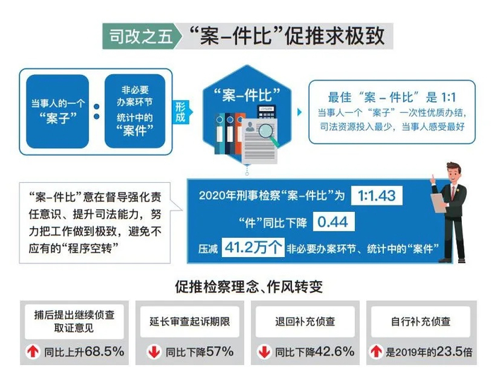 深化运用“案-件比”质效评价标准。发布以“案-件比”为核心的案件质量评价指标,以知促行,引导检察办案求极致,惠及群众、减少讼累。2020年刑事检察“案-件比”1:1.43,“件”同比下降0.44,压减了41.2万个非必要办案环节、统计中的“案件”。更重要的是检察理念、作风在转变:延长审查起诉期限、退回补充侦查同比分别下降57%和42.6%;自行补充侦查4.8万件,是2019年的23.5倍;不捕不诉率进一步上升,公安机关提请复议复核则下降40.2%,办案质效明显提升。