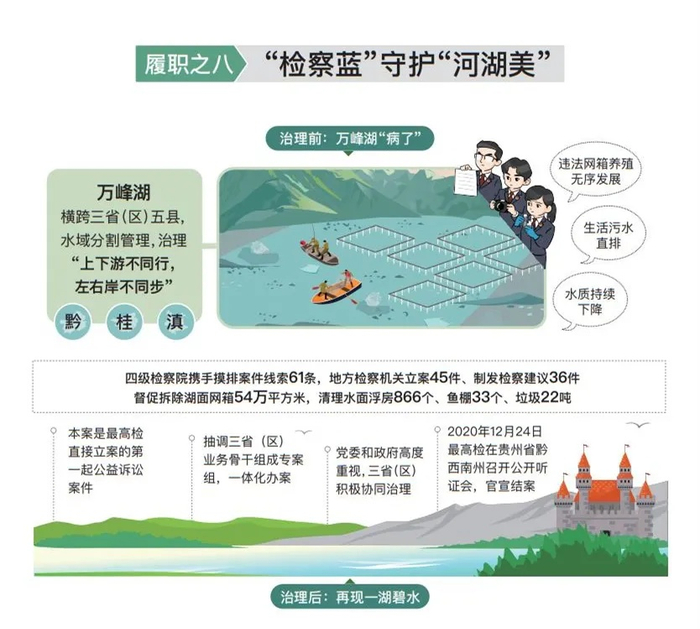 保卫蓝天碧水净土。助力污染防治攻坚,起诉破坏生态环境资源犯罪5.1万人,办理相关公益诉讼案件8.4万件,同比分别上升0.9%和21%。万峰湖地处黔桂滇接合部,因无序养殖、水质恶化,2016年、2017年连续两次被中央环保督察点名。治防分属管辖,效果不如人意。最高人民检察院直接立案,三地党委和政府大力支持,协同治理、联手防控,再现一湖碧水。与生态环境部等开展危险废物环境违法犯罪专项打击。会同自然资源部开展试点,强化土地执法领域协作,落实最严格耕地保护制度。出台检察政策,服务保障长江十年禁渔,促进综合运用刑事、行政、经济手段惩治非法捕捞。