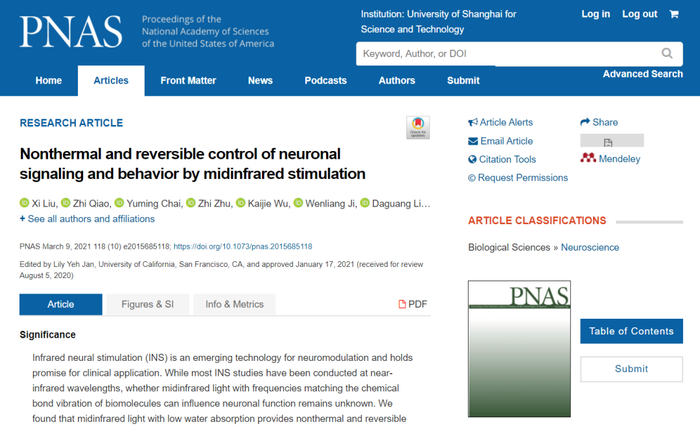 3月1日,美国科学院院报《PNAS》在线发表了题为《通过中红外刺激实现神经信号与动物行为的非热、可逆调控》(Nonthermal and reversible control of neuronal signaling and behavior by midinfrared stimulation)的论文,首次从理论和实验双重角度发现并提出了神经信号和脑功能调控的新机制和新策略,在学界引起了强烈反响。