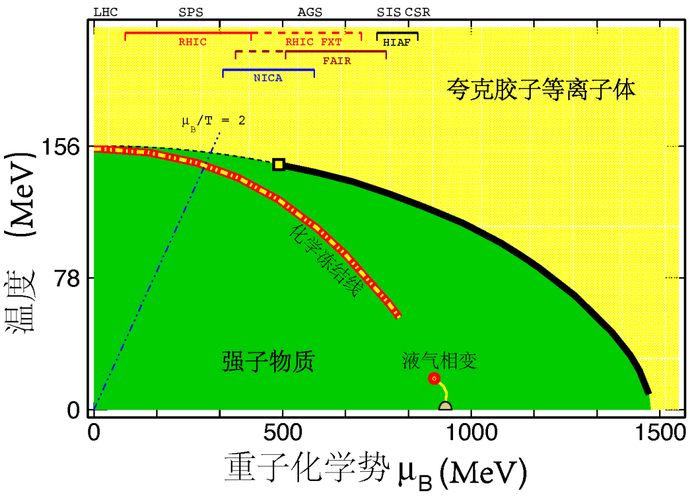 QCD相图,纵坐标为温度T,横坐标为重子化学势µB。黑色实线为一级相变边界。正方形框标示了可能的QCD临界点位置。红色点代表普通核物质的液气相变临界点。相图的顶部标出了不同重离子碰撞实验的相图覆盖范围。