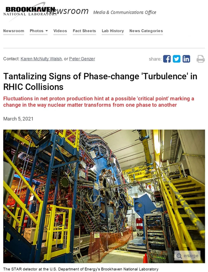 来源:华中师范大学我校物理科学与技术学院罗晓峰、刘峰课题组与美国劳伦斯伯克利国家实验室(LBNL)、日本筑波大学、印度国家科学与教育研究所等单位合作,首次在RHIC-STAR重离子碰撞能量扫描实验中观测到净质子数四阶涨落的非单调能量依赖。美国布鲁克海文国家实验室第一时间报道了该重要实验成果。