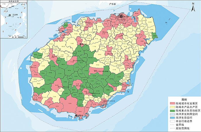以资源环境承载力和国土空间开发适宜性评价为基础,服务自由贸易港建设等国家战略需要,按照陆海统筹、生态优先的原则,将全省陆域划分为城市化发展区、农产品主产区、重点生态功能区,将近岸海域划分为海洋生态空间、海洋开发利用空间。
