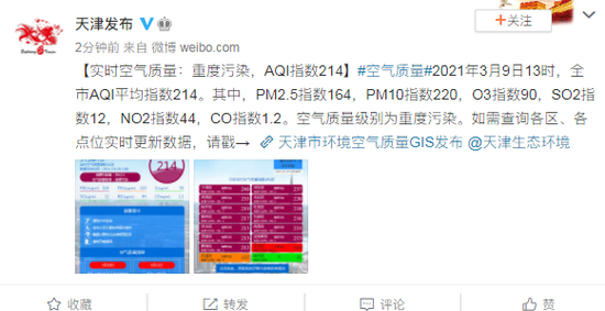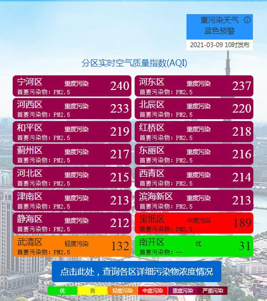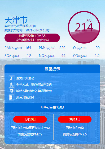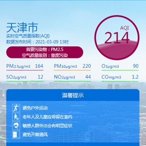 2021年3月9日13时,全市AQI平均指数214。其中,PM2.5指数164,PM10指数220,O3指数90,SO2指数12,NO2指数44,CO指数1.2。空气质量级别为重度污染。如需查询各区、各点位实时更新数据。