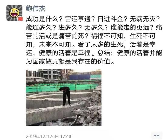 陪护的同事说,前两天,鲍伟杰清醒过一会儿,他插着管,睁着眼睛,流了眼泪。鲍伟杰成了新闻里的人,很多人被他朋友圈那句“健康的活着并能为国家做贡献是我存在的价值”怦然打动。