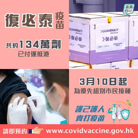 至于复必泰疫苗,优先组别的市民3月10日起,可在医管局营运的7间社区接种中心接种。另外,香港特区政府会于3月16日起开放另外12间接种中心为优先组别的市民预约16日至30日接种复必泰疫苗的名额。