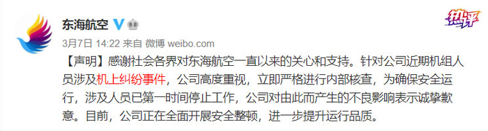 这则消息在3月6日经网络曝出后,东海航空对两名涉事人员做出了暂停飞的处理,深圳民航管理单位第一时间约谈了深圳东海航空有限公司。民航中南地区管理局也于3月8日进行通报,表示待相关情况查明后,将本着实事求是的原则,依法依规对责任单位及责任人员作出相应的处理,同时强调安全是民航的生命线,对于任何危及航空安全的行为,民航行业管理部门都将依法严厉惩处。