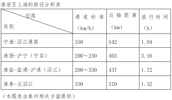 史立军认为,今年即将开工建设的北沿江高铁和盐泰锡常宜铁路,以及规划的淮泰高铁建成后,三条高铁线路设计时速均达350km/h。那么,本线可与盐泰锡常宜铁路、北沿江高铁(起自上海终至合肥)共同形成高标准入沪新通路,进一步提升京沪二通道的服务质量和服务水平。“根据运输距离并结合相关能力分析,淮泰-北沿江的径路运输距离最短、旅行时间最短。”