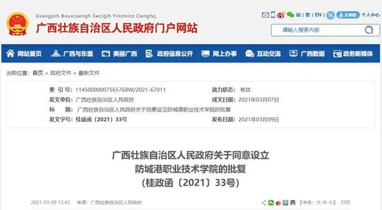 3月9日,自治区人民政府印发《关于同意设立防城港职业技术学院的批复》,同意设立防城港职业技术学院。
