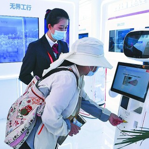 2020年中国国际服务贸易交易会上展出的智能银行机器人,它可以通过人脸识别技术,为客户提供金融服务。新华社 图