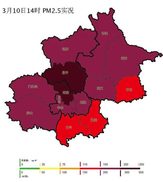 最新的PM2.5实况显示,城六区仍然重度污染,昌平、海淀严重污染。