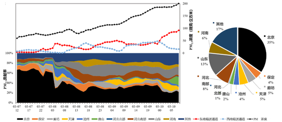 区域上,传输贡献前三的区域是山东,河北南部和河南,贡献分别为13%、8%和6%。整体看来,东南通道输送贡献约29%,西南通道输送贡献约18%。因此,对北京市而言,本次过程是以东南通道输送为主、西南通道输送为辅的推动下,叠加本地排放所共同导致的。