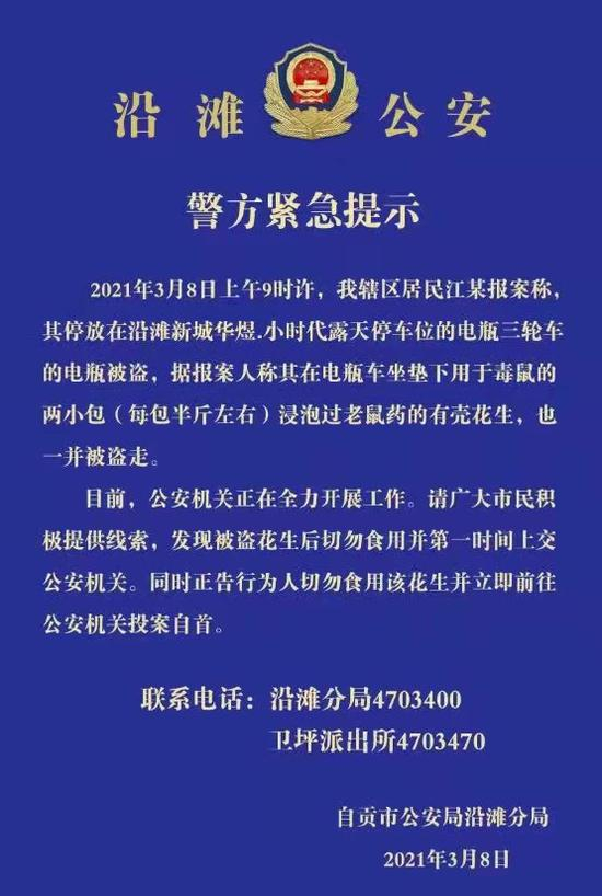 “人命关天的事情,宁可信其有、不可信其无。”沿滩公安分局副局长查克全告诉红星新闻记者,之所以发布紧急提示,就是希望发动社会各界的力量传播该信息,提醒大家切勿误食不明来源的花生,同时也是提醒嫌疑人别误食并正告其主动投案自首。