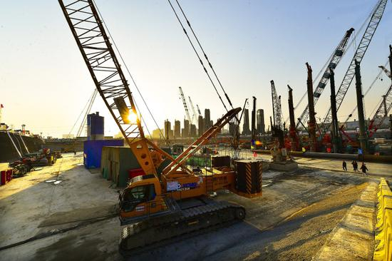 城市副中心站综合交通枢纽项目工地大型机械矗立如林,巨型钢柱将撑起站房的主体结构。
