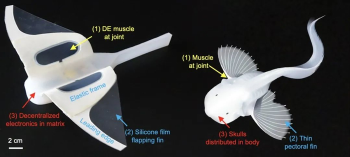 2020年8月27日凌晨三点,形似一条鱼,长22cm、翼展宽度28cm,完全无耐压壳保护的仿生软体机器人在中国南海3224米海深处实现自主游动。