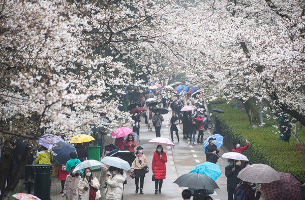 武汉的樱花,终于等来了人海。3月樱花初绽,作为赏樱的网红打卡地,武汉大学于3月8日正式向公众开放。长约600米的樱花大道上,成团簇拥的樱花迎风冒雨傲然绽放,花伞浮动,游人如织。记者从校方获悉,截至目前,已有两万多社会公众来武大赏樱。