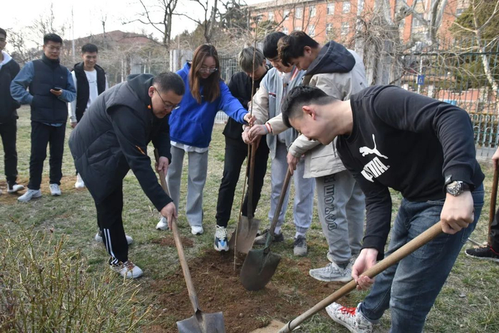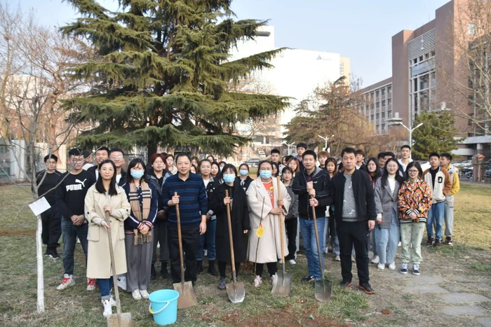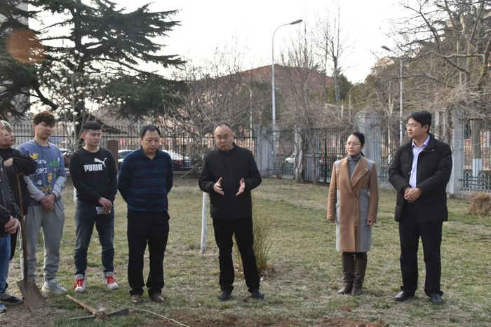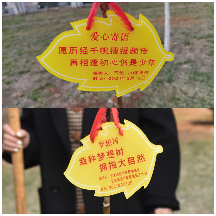 ①3月12日下午,校党委常委、宣传部部长陈伟、学生工作处处长焦红良、校团委书记高洁、后勤处副处长、环设183班主任刘盛东、艺术与设计学院党总支副书记徐佐君,一同在市北校区南院空地上,栽种希望树,学院各年级辅导员、校领导联系班级、校级活力团支部环设183、艺术与设计学院学生会、艺术与设计学院易班工作站全体同学参加。