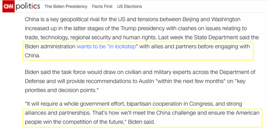 拜登政府希望在与中国接触之前与盟友和伙伴 “步调一致”。拜登直言,工作组就是我们将迎接中国挑战并确保美国人民赢得未来竞争的方式。