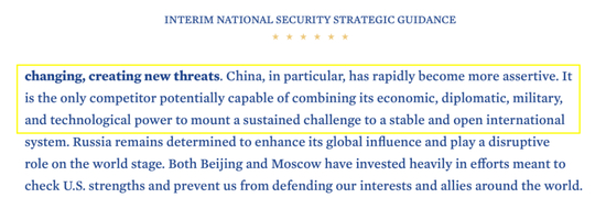 《国家安全战略临时指南》:特别是中国,已经迅速变得更加坚决。中国是唯一有能力将其经济、外交、军事和技术力量结合起来,对稳定和开放的国际体系构成持久挑战的潜在竞争对手。