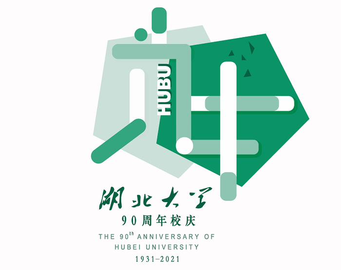 设计理念:此Logo为了凸显90周年校庆主题,以“九十”为主体,左边的“九”几何化后形状为抽象的编钟,契合了学校的标志。Logo主要采用的配色也是经典的湖大绿,并配以湖北大学的缩写“HUBU”,表现学校的风采。