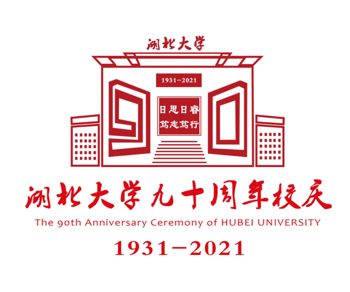 设计理念:标志主体以湖北大学标志建筑——行政楼及周边教学楼、数字“90”、湖北大学校训“日思日睿,笃志笃行”以及“台阶”为主要设计元素,整体设计元素多样、简洁开放,彰显了学校的文化与历史;标志主体采用红色,象征着热情、勇敢与希望,喜庆大方,既突出90周年校庆欢乐祥和的氛围,又描绘了90年来湖北大学各项事业根基深固、蓬勃发展、生机永畅的美好图景。